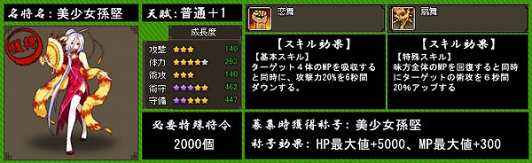 特殊将令2000個と交換で獲得できる美少女孫堅は、ゲーム内屈指の防御性能を誇り、あなたのパーティーを妖怪達の猛攻から守ります。また、スキル効果により敵のMPを吸収できるため、MP消費の激しいアクティブスキルとの相性は抜群です!
