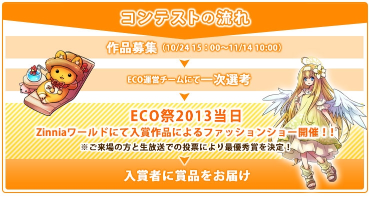 一次選考を通過し入賞した作品は、2013年12月7日(土)に開催されるオフラインイベント「ECO祭2013」当日に、Zinniaワールド内において開催予定の「ファッションショー」にてお披露目!さらに、当日の「ECO祭2013」にご来場の方と生放送での投票により「最優秀賞」を決定しちゃいます!栄冠は誰の手に!?大勢の方のご参加をお待ちしております。目指せファッションリーダー!!