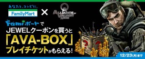 期間中、全国のファミリーマート店舗に設置しているマルチメディア端末「Famiポート」でJEWELクーポンを お買い求めいただくと、JEWELクーポンの購入金額に応じた枚数分の「AVA-BOXプレイチケット」の シリアルコードがもれなくついてきます。