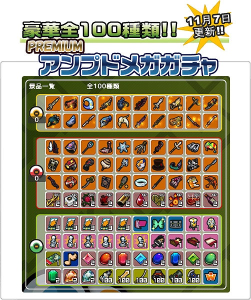 更に11月7日(木)メンテナンス終了後から12月5日(木)メンテナンス開始前までの間、「素材」アイテムと「ぶき」アイテムの獲得個数を増加させていただきます。また、2013年11月7日(木)メンテナンス終了後からプライムマーケットでは新規「アバターパーツ」と「マイルーム」アイテムを販売いたします。期間限定のセット販売も開始いたしますので、この機会をお見逃しの無いようご利用ください。