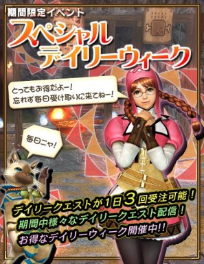1日に決まった回数しか遊ぶことのできない代わりに、HRPを大量にもらえたり、ゼニーを多く稼げたりなど、ハンターにとってうれしい特典があるクエスト……それがデイリークエストです。デイリークエストは通常1日に1回しか受けられませんが、この度、下記日時より「スペシャルデイリーウィーク」を開催。