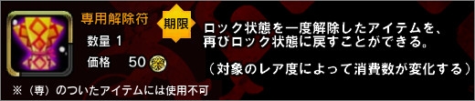 また、本日登場の「専用解除符」は、アイテムをロック状態から解除できる便利アイテムです。ご自慢の装備を誰かに譲りたい、オークションに出品したいという時にはきっと役立つでしょう。
