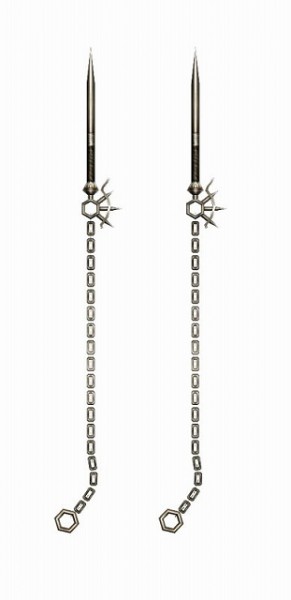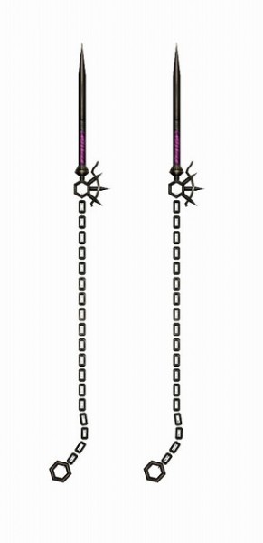 ライダーの攻撃を再現した、特殊リーチ「極長」の双剣。納刀、抜刀時は普通の双剣のような形状ですが、攻撃時は鎖を把持して短剣を投擲するようなギミックが発動!「MHF-G」だけのカラーバリエーションとして、黒い刀身が特徴的な「無銘・短剣【黒】」もラインナップしております。