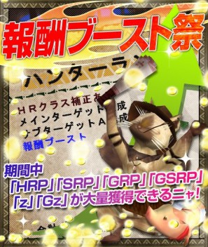 「報酬ブースト祭」開催!今週はHRPやGRP、ゼニーやGzをブースト!クエスト報酬が大幅に増加する「報酬ブースト祭」。今回は、ハンターのランクに応じて、HRPやゼニーなどにブーストがかかります。G級を体験してないハンターのみなさまも、すでにG級を堪能していただいているハンターのみなさまも、ぜひこのブースト期間に多額の報酬を得てください!