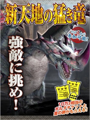 強力なモンスター相手に立ち回れ!「新天地の猛き竜」開催!強力なモンスターを相手にクエストクリアすることで、高額で売却できる「ポルタチケット」や「金のたまご」を入手できるイベント「新天地の猛き竜」を開催致します!「MHF-G」の強力なモンスターに挑み、ぜひ多額の報酬を得てください!