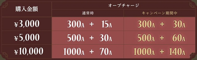 キャンペーン期間中、1度に3,000円以上のオーブを購入すると、オーブボーナスが通常時の2倍となり、さらにアカウント内に存在するキャラクター全員にアイテム「育成支援セット」をプレゼントいたします。