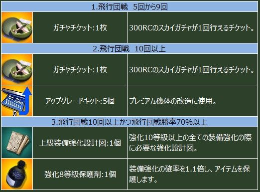 期間中、飛行団戦の回数に応じて、アイテムをプレゼントいたします!所属している飛行団の誇りにかけて、ドシドシご参加ください!