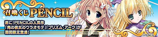 ONE-UPは、「メガミエンゲイジ!」において、PENCILの「俺の彼女のウラオモテ」および「プリズム・アーク」のキャラクターカードを期間限定で実装、召喚くじプラチナのラインナップ変更に伴い、2大キャンペーンを開始する。