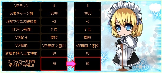 2013年11月29日(金)定期メンテナンスにて、「VIP機能」のストライカー所持枠を拡大いたしました。「VIP機能」とは、スターズの累計チャージ額に応じて、ランクが変化するシステムです。プレイヤーのVIPランクによって、利用できる各種ゲーム内機能が解放されていきます。そんな便利な「VIP機能」ですが、本日はVIPランク8のストライカー所持枠と最大購入枠が拡大されました。