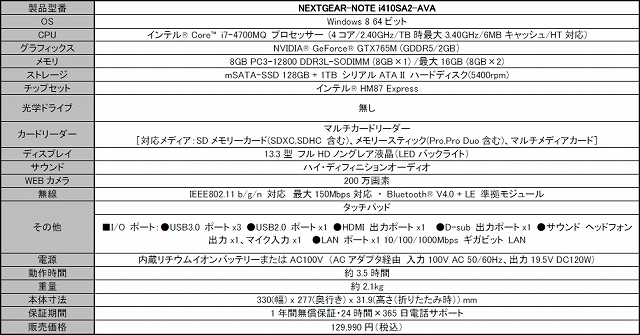 外出先でも「AVA」を体感できる、エントリーモデルの13.3型モバイルゲーミングノートパソコンとして、インテル Core i7-4700MQプロセッサー、8GBメモリ、mSATA規格の128GB SSD、大容量1TBハードディスク(5400rpm)、NVIDIA GeForceGTX765M、Windows 8をプリインストールした「NEXTGEAR-NOTE i410SA2-AVA」を12万9,990円でリリースいたします。