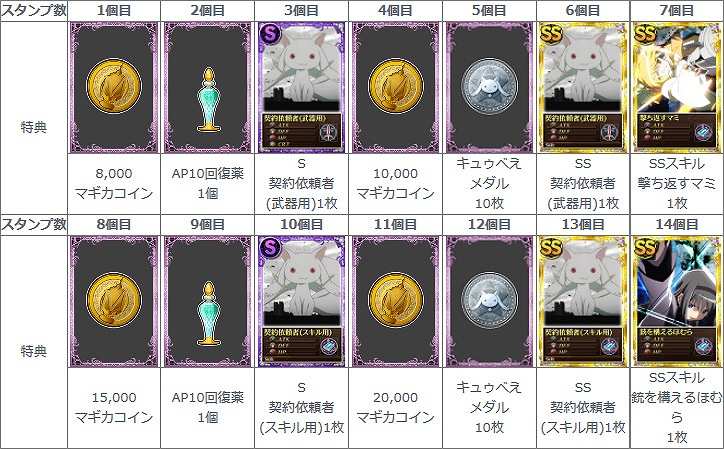 | 25体 | 30,000 マギカコイン | レアリティ S「契約依頼者(武器用)」×2枚 | キュゥべえメダル×30枚 |