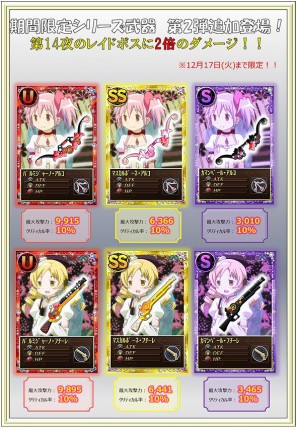 12月3日(火)より「プラチナキュゥべえ BOX」の更新を実施しました。 アニマルシリーズから、さやかのスキルカードと武器が登場の他、レイドイベント「ワルプルギスの夜 第 14 夜」に登場するレイドボスに有効なレイドキラー武器が追加されました。さらに、レアリティ UU 武器「カラミタ・カラブロネ」が初登場となっております。