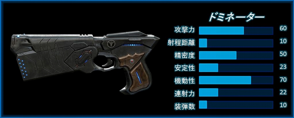 正式名称は「携帯型心理診断鎮圧執行システム・ドミネーター」。公安局の執行官と監視官のみが携帯を許される特殊な拳銃。コラボ限定銃器「ドミネーター」は、戦場での戦闘を想定し実弾での高い攻撃力を持ち合わせ、射撃時に安定性を追求したハンドガンとなります。