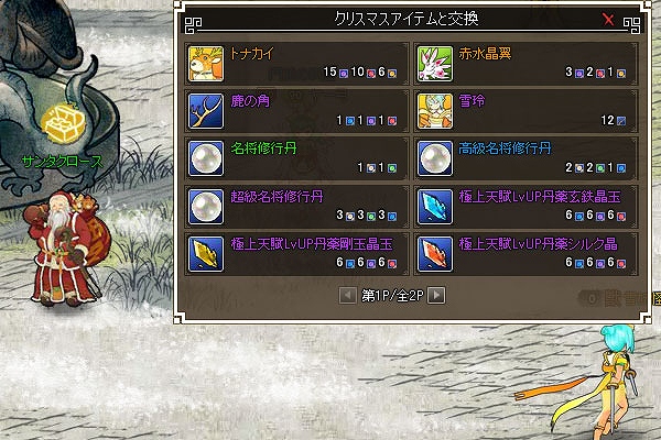 ゲーム内で獲得できる 6色の「キャンディー」や「鹿の角」は、NPC「サンタクロース」の交換屋で好きなアイテムに交換する事ができます。