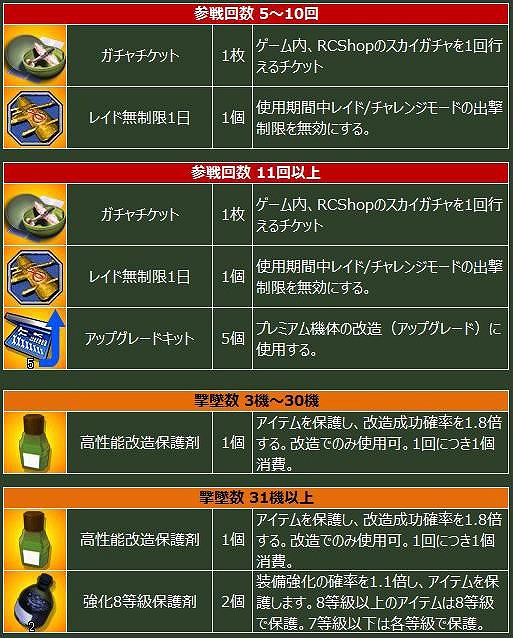 期間中、週ごとに以下の条件を満たしたパイロットにアイテムをプレゼント!1週目に条件を満たして報酬をゲットした人でも、2週目も条件をクリアすれば報酬を獲得できますので、この機会にぜひ格闘戦に参加して、報酬をたくさんゲットしよう!