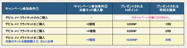 「デビル メイ クライキット」と合わせてのご購入がお得!Nポイント大量入手のチャンスです!2013年12月12日(木)発売の「デビル メイ クライキット」と「カプコンタイトルコラボキット」を合わせてご購入いただいたお客様に、もれなくNポイントや特別交換券をプレゼント!キットを多くご購入いただけばそのぶん得られるポイントや特別交換券の枚数が大幅増となりますので、購入をご検討中のハンターさんは、ぜひ本キャンペーンを活用してください!
