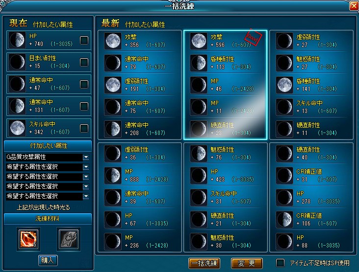 「製造-洗練」に「一括洗練」機能が追加されます。「一括洗練」機能は、5つの月華氷晶を使用して6回分の洗練を一括で行う機能となります。