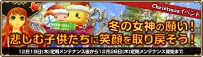 クリスマスシーズン到来にちなみ、クリスマス気分をご満喫いただけるシステムイベントを実装いたしました。冬の女神様からのクリスマスプレゼントを受け取れていなかった子供たちへプレゼントを見つけて届けてあげてください。見事届け終わり、子供たちに笑顔を取り戻していただくと、クリスマス限定報酬アイテムをご獲得いただけます。限定衣装など盛りだくさんとなっておりますので、ぜひご参加ください。