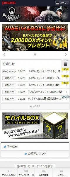 「AVA」ゲームと連動した、スマートフォン専用(iPhone・Android)サイトです。 前日のゲームログインや新規フレンド追加など、様々な条件で「モバイルBOXポイント」が付与されます。