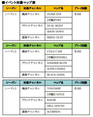 各シーズン期間中に対象となったチャンネル・マップを各3回ずつプレイすると豪華アイテムをプレゼント。さらに全シーズンに参加いただくと豪華景品を抽選でプレゼントいたします。