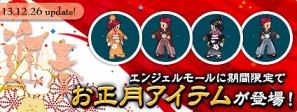エンジェルモールにお正月の定番「紋付袴」「振袖」アイテムが今年も期間限定で登場します!また、お正月限定ペーパードールの限定色/無期限、ステータスの付与されたPDや、青文字PDが大当りで獲得できる「賀正卵2014」も登場です!