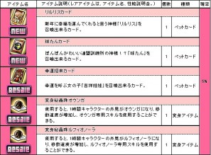 新春をかわいく彩るさまざまなアイテムが当たる新商品「戎箱」がアイテムモールに登場しました。意外と武闘派な神様「リルリス」や幸福を呼び込む少女「吉祥娃娃」を召喚できる各種ペットカードと、大人気を誇るモンスター「オウンガ」や「ルフィオノーラ」に変身できる秘晶珠など、戎の名に恥じない超豪華なラインナップ!