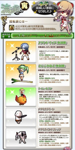 過去に登場したお楽しみ袋で人気を集めた大当たりアイテムを厳選した新商品「流転袋[寅]」を販売開始!あったかいお鍋が食べたくなる騎乗アイテム「きらふわねぎ」や紳士淑女向けの騎乗アイテム「デイム・ピヨン」。