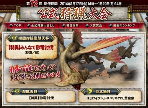 カプコンは、「モンスターハンター フロンティアG」において、1月17日14時よりゲーム内イベント「第72回公式狩猟大会」を開始する。