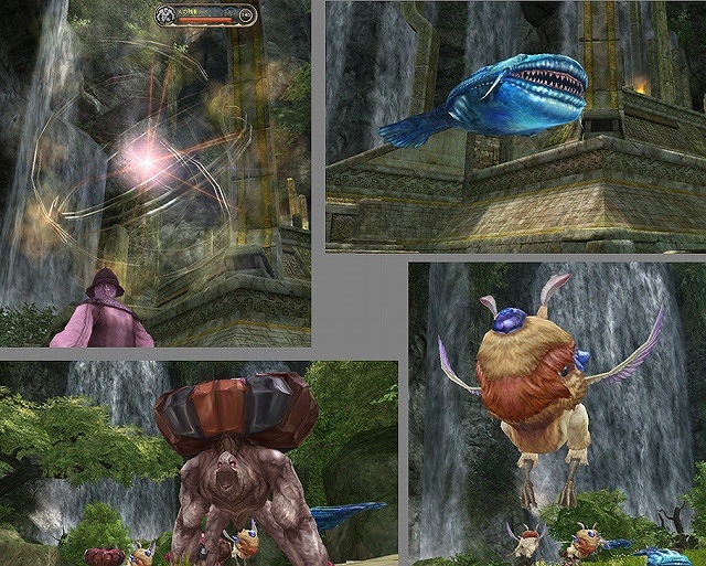 左上が“火の残影”、右上が“水のブルーフィッシュ”。下段は左下が“土のマイコニド”で右下が“風のアコル”だ。体つきは他のモンスよりも一回り大きい。