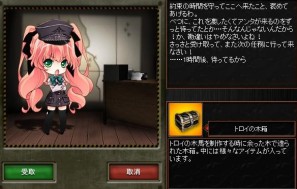 中立基地(Public Town)の格納庫とRCショップの間に、現在、実施中のレイドに登場する「トロイの木馬」が登場!!トロイの木馬をクリックすると、シュヴァルベのリリーから1時間に1度、「トロイの木箱」のプレゼントを受け取ることができます!リリーからプレゼントがもらえるのは1時間ごと00分から5分の間です!