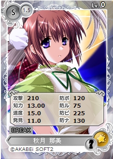 「あかべぇそふとつぅ」の「魂響~たまゆら~」が初登場。同作品より新カードを公開致します。 今回登場する限定カードは「あかべぇそふとつぅ」の「魂響~たまゆら~」から「秋月 かすみ(SS)」、「秋月 那美(S)」、「九重 真咲(A)」の 3枚となります。