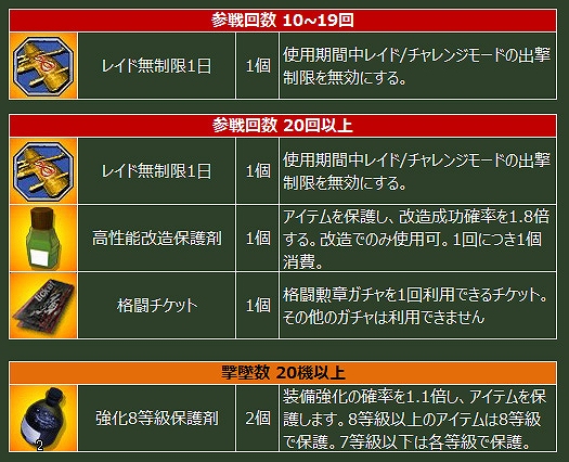 期間中、週ごとに以下の条件を満たしたパイロットにアイテムをプレゼント!1週目に条件を満たして報酬をゲットした人でも、2週目も条件をクリアすれば報酬を獲得できますので、この機会にぜひ格闘戦に参加して、報酬をたくさんゲットしよう!