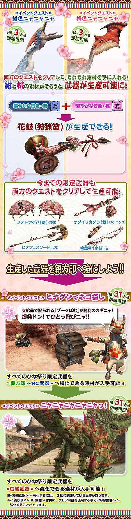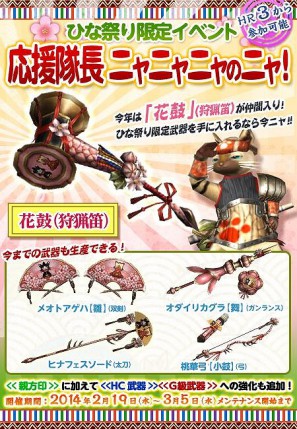 下記日時におきまして、オリジナルの武器が手に入る ひな祭りイベント「応援隊長ニャニャニャのニャ!」が開催! イベントクエストをクリアすることで、新登場の狩猟笛「花鼓」を含む 5種類の武器の生産素材が手に入ります! さらに今回は、新規武器・既存武器ともに 親方印・HC 武器・G級武器への強化が解禁! 強化用の素材もイベントクエストをクリアすることで手に入りますので、 ハンターのみなさまはぜひ本イベントにご参加ください!