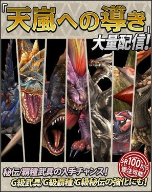 「天嵐への導き」では、「秘伝防具」や「覇種武具」「G級武具」の 生産・強化に必要なHC素材を入手しやすいクエストを多数配信! 各種クエストは日ごとに入れ替わりますので、 ほしい素材が手に入るクエストをお見逃しなく!