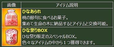 イベント期間中、全てのミッションで敵機を撃墜すると一定確率で「ひなあられ」がドロップします!「ひなあられ」を 50個集めると、「ひな祭り BOX」と交換できます!どんなアイテムが獲得できるかは BOX を開けてからのお楽しみ!