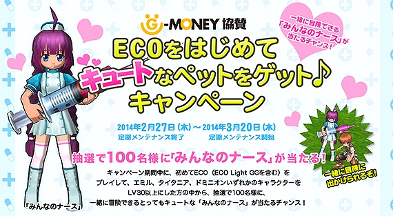 キャンペーンキャンペーン期間中に、初めてECO(ECO Light GGを含む)をプレイして、エミル、タイタニア、ドミニオンいずれかのキャラクターをLV30以上にした方の中から、抽選で100名様に、一緒に冒険できるとってもキュートな「みんなナース」をプレゼント!