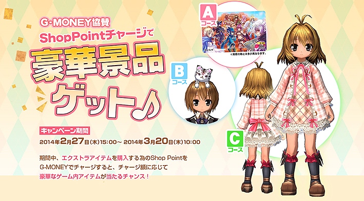 キャンペーン期間中エクストラアイテムを購入する為のShop PointをG-MONEYでチャージすると、豪華なゲーム内アイテムが当たるチャンス!