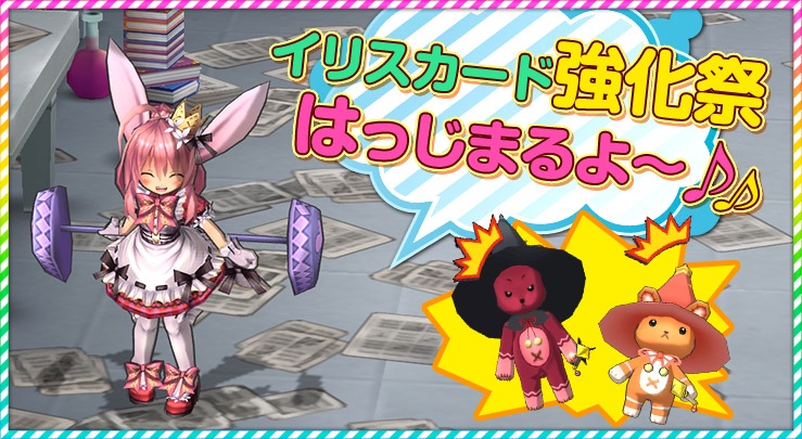 ミニー・ドゥ・アルマの持ってきた前回とは違う「押すととっても幸せになれちゃうスイッチ」を今度はダンプティーが押してしまったために、武具に装着することでステータスなど様々な能力が強くなるイリスカードのアセンブルやスロット追加の成功確率がアップする「イリスカード強化祭」がはじまってしまいます。この効果は一週間続いてしまうとか…。