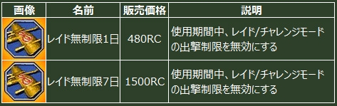 レイド/挑戦の入場制限を無効にできるアイテムをRCショップで期間限定販売!