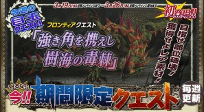 また、本日からフロンティアクエストにも「強き角を携えし樹海の毒棘」を配信! こちらは棘竜「エスピナス」が登場となっておりますので、 強力なエスピナシリーズ装備を生産してください。