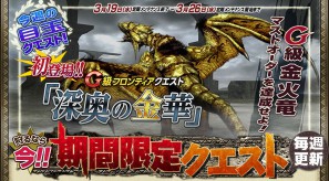 2014年3月19日(水)より、期間限定クエストの G級フロンティアクエストにてリオレイア希少種が出現する「深奥の金華」を配信いたします! このクエストはマストオーダーが設定されており、通常より難度は高くなっておりますが、 その分、リオレイア希少種の素材を獲得しやすいのが特徴。もちろんHC化も可能です
