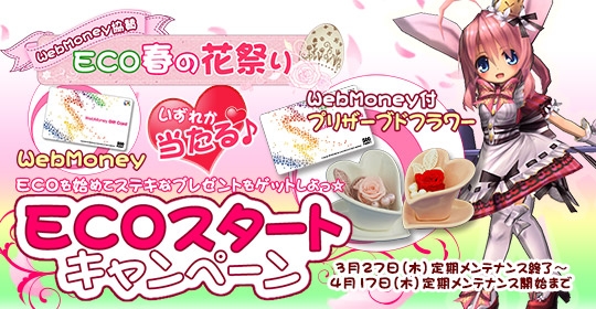 さらに、春の訪れを記念して、ECOの世界のお祭りに新たに参加しようという方や、思う存分お祭りを遊びたいという方にとってもお得なWebMoney協賛のキャンペーンを開催いたします。