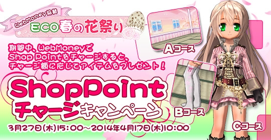 WebMoneyで合計20,000Shop Point(2,000円分)以上チャージした方の中から抽選で100名様にECOゲーム内アイテム「壁紙(桜)」をプレゼント。