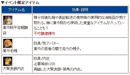 イベント期間中、ボスモンスター「張角」「張宝」「張梁」が「黄巾祭壇」に再臨し、彼らを倒すと一定の確率で魅力的なアイテムが入手できるほか、任務報酬として大量の経験値も獲得できます。三兄弟は黄巾不死身となり体力、防御力など非常に強力ですので、等級220以下の方はNPC「黄巾賊平定校尉」からもらえる「破妖の符」を使用しましょう。