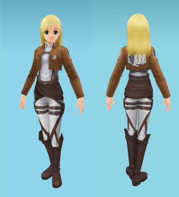 今回のコラボレーションでは、主人公エレン達と同じく104期訓練兵団に所属していた「クリスタ・レンズ」になりきれる一式装備「クリスタなりきり装備セット」が登場いたします。献身的なキャラクターのクリスタになりきれば、あなたも女神様と呼ばれるかもしれません。コラボレーションの詳細は下記をご確認ください。