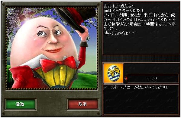 中立基地(Public Town)の格納庫とRCショップの間に、「グレードエッグ」が登場!!「グレートエッグ」をクリックすると、「イースター大臣」から1時間に1度、「エッグ」50個を受け取ることができます。