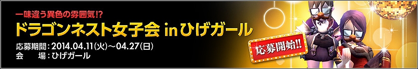 待望の第 2 弾、「ドラゴンネスト女子会 vol.2 in ひげガール」を開催いたします。今回も、ご来場いただいたお客様全員にスペシャルプレゼントをご用意しております。さらに、当選されたお客様のご友人も一緒に参加することができます、奮ってご応募下さい。