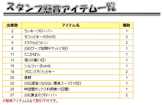 スタンプは1日に1回押すことができ、スタンプが貯まると懸賞アイテムをもらうことができます!懸賞アイテムは、トキヤNPC「拾八号式」で受け取りましょう。