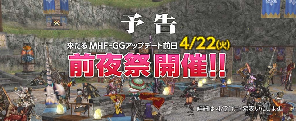 さらに「モンスターハンター フロンティアGG」大型アップデートの前日となる2014年4月22日(火)には前夜祭の開催が決定!詳細は2014年4月21日(月)に発表となるので是非、期待していただきたい。