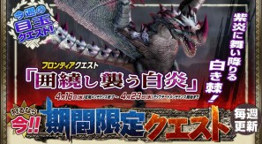 2014年4月16日(水)より、期間限定クエストのG級フロンティアクエストにて「峡谷を駆ける闘獣」を配信!このクエストは小型モンスターが対象になっているサブターゲットが設定されており、達成することで、クエストクリアとすることが可能。部位破壊報酬のみを獲得したい場合に適したおすすめのクエスト。また、本日からフロンティアクエストにも「囲繞し襲う白炎」を配信!こちらは棘白竜「エスピナス希少種」が登場するクエストとなっているので、是非、奮って参加しよう!